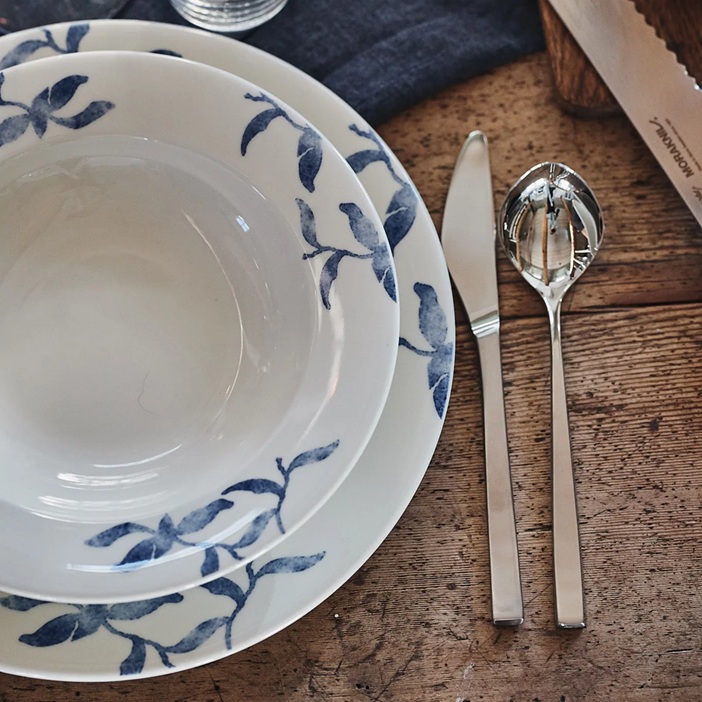 Serviset er laget i hvitt feltspaltporselen, og kan vaskes i oppvaskmaskin. Dette, sammen med den blå dekoren, er med på å skape et elegant uttrykk på matbordet.