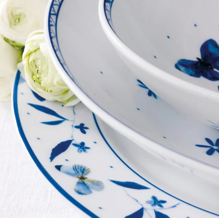 Serviset er laget i høybrent feltspatporselen, som gir et sterkt og glansfullt resultat. I kolleksjonen finner du tallerkener og asjetter i flere størrelser, og også med ulik dekor, både innen Flower og Butterfly.