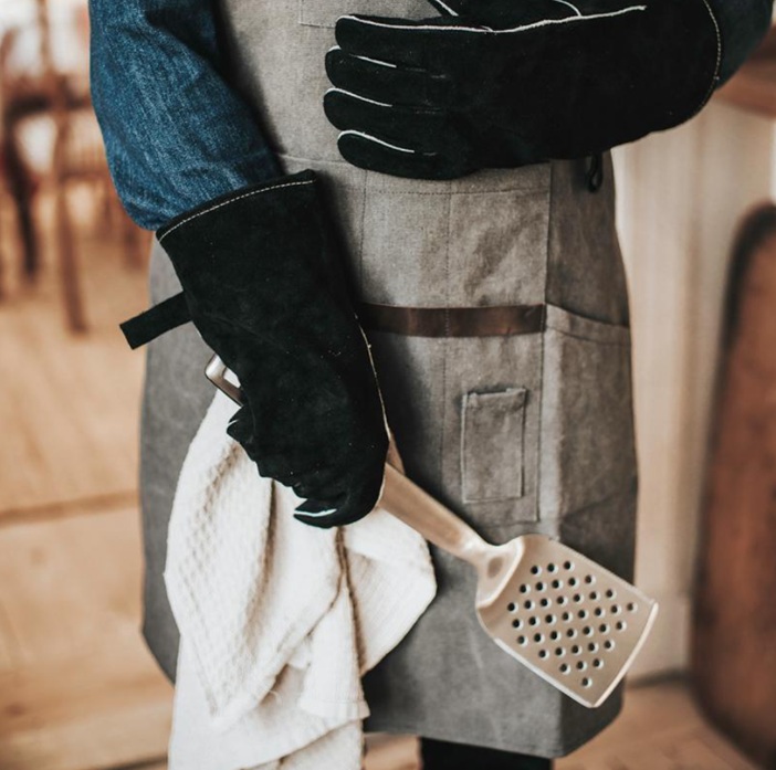 - Grått kokkeforkle fra svenske Dorre med detaljer i brunt kunstskinn