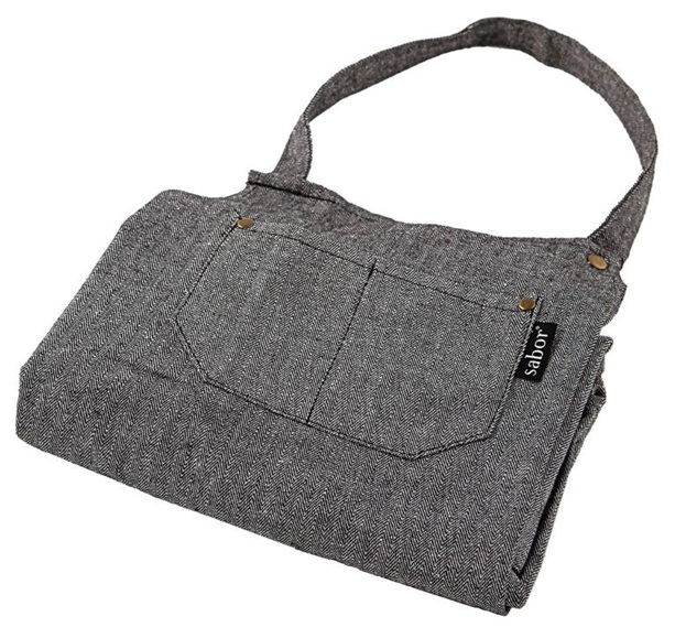 Fra Sabor finner vi deres grå kjøkkenforkle til den moderne hjemmekokken. Forkleet er utstyrt med messingknapper som passer fint til det grå fiskebensmønsteret.